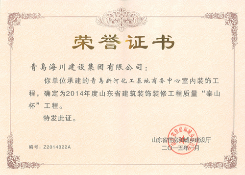 近日,公司從山東省住房和城鄉建設廳捧回五項泰山杯獎證書,其中2014年度山東省建筑工程質量泰山杯工程證書三項;2014年度山東省建筑裝飾裝修工程質量“泰山杯”工程證書兩項。